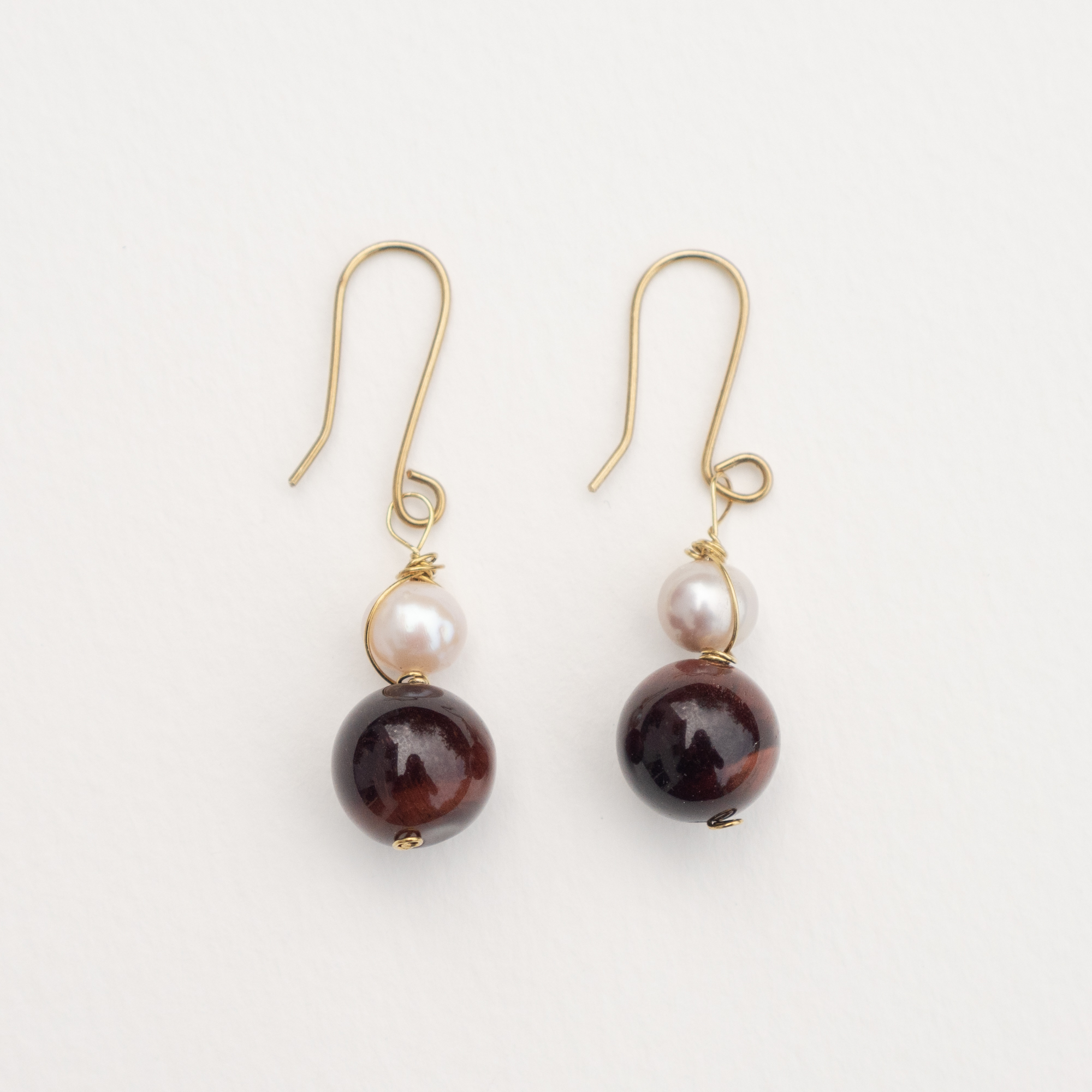 Hand-shaped pure brass earrings with tiger eye and real pearl