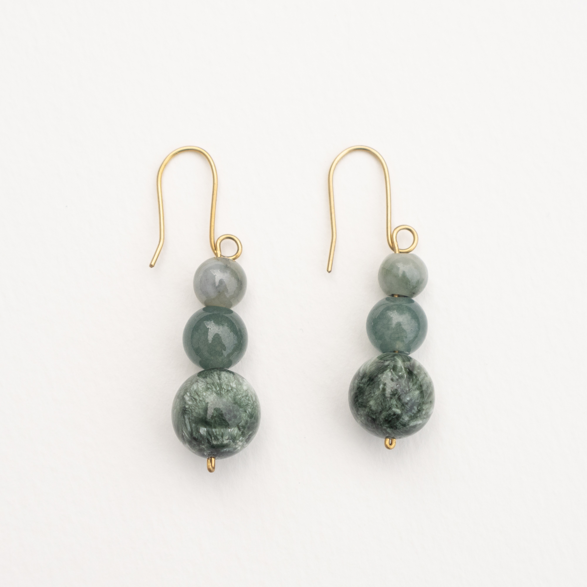 Hand-shaped pure brass earrings with seraphinite, aventurine and jade