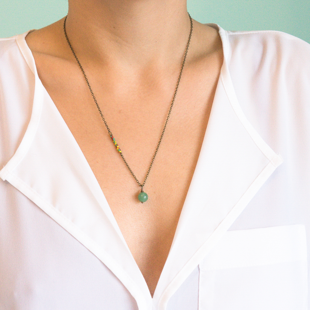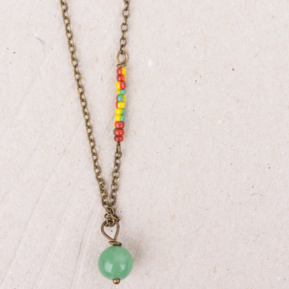 green jade with colorful glass beads on brass